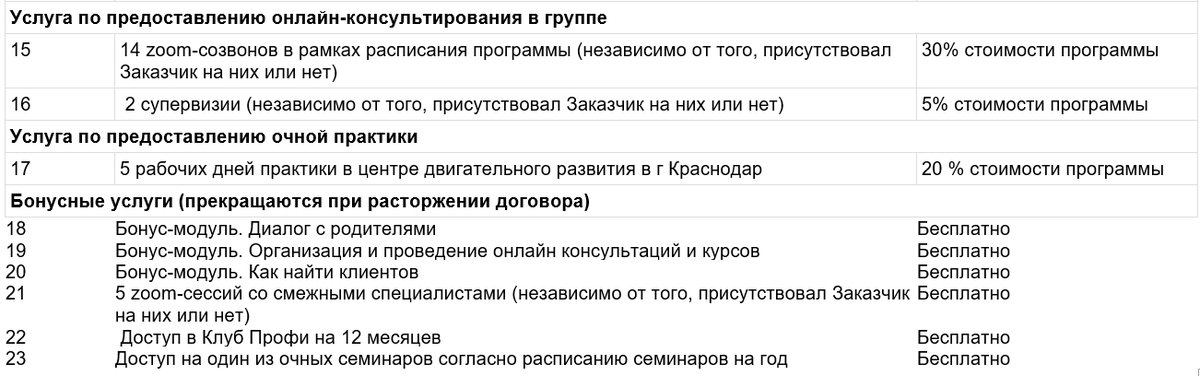 2.2. Стоимость услуг Исполнителя (цена Договора) указана в Приложении № 1 к Оферте, на Сайте https://massagnaya-mama.ru/DM_12p (в том числе в период акций, скидок и т.д.), ссылке на оплату. Стоимость не включает НДС, т.к. Исполнитель не является плательщиком НДС. Цена Договора включает компенсацию Исполнителя и причитающееся ему вознаграждение. Стоимость Договора включает фактически понесенные Исполнителем расходы, которые включают (но не ограничиваются) расходы по созданию образовательных услуг и полезных материалов, привлечения Заказчика, расходы на оплату третьих лиц, комиссии банковских, кредитных организаций и соответствующих платежных систем за предоставление рассрочки и причитающееся ему вознаграждение.