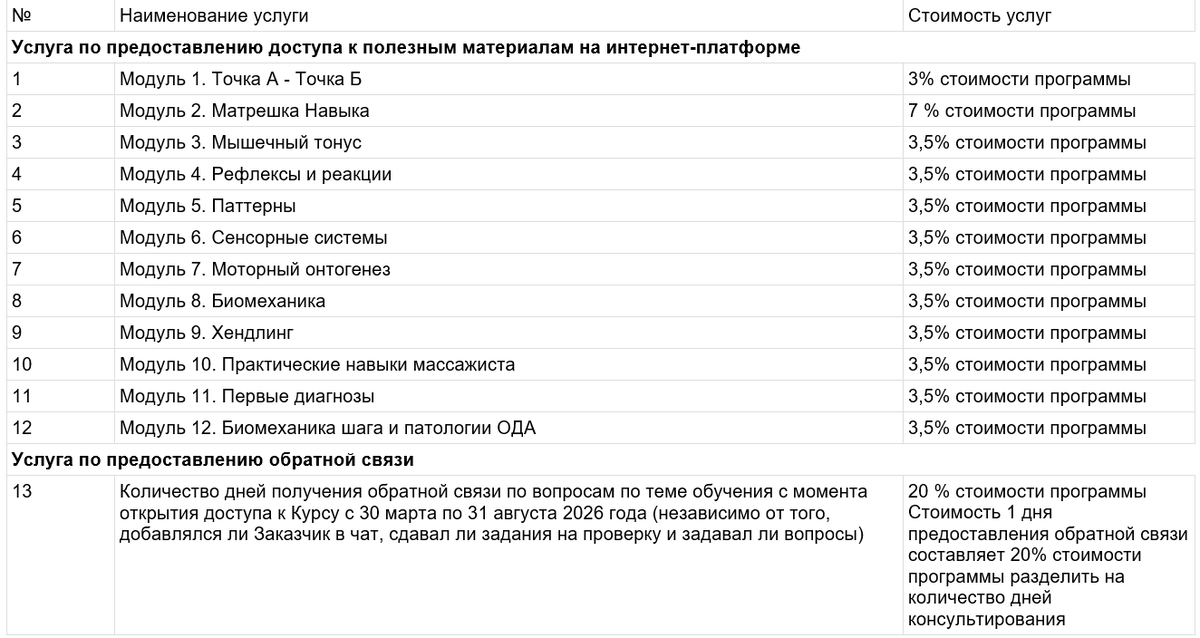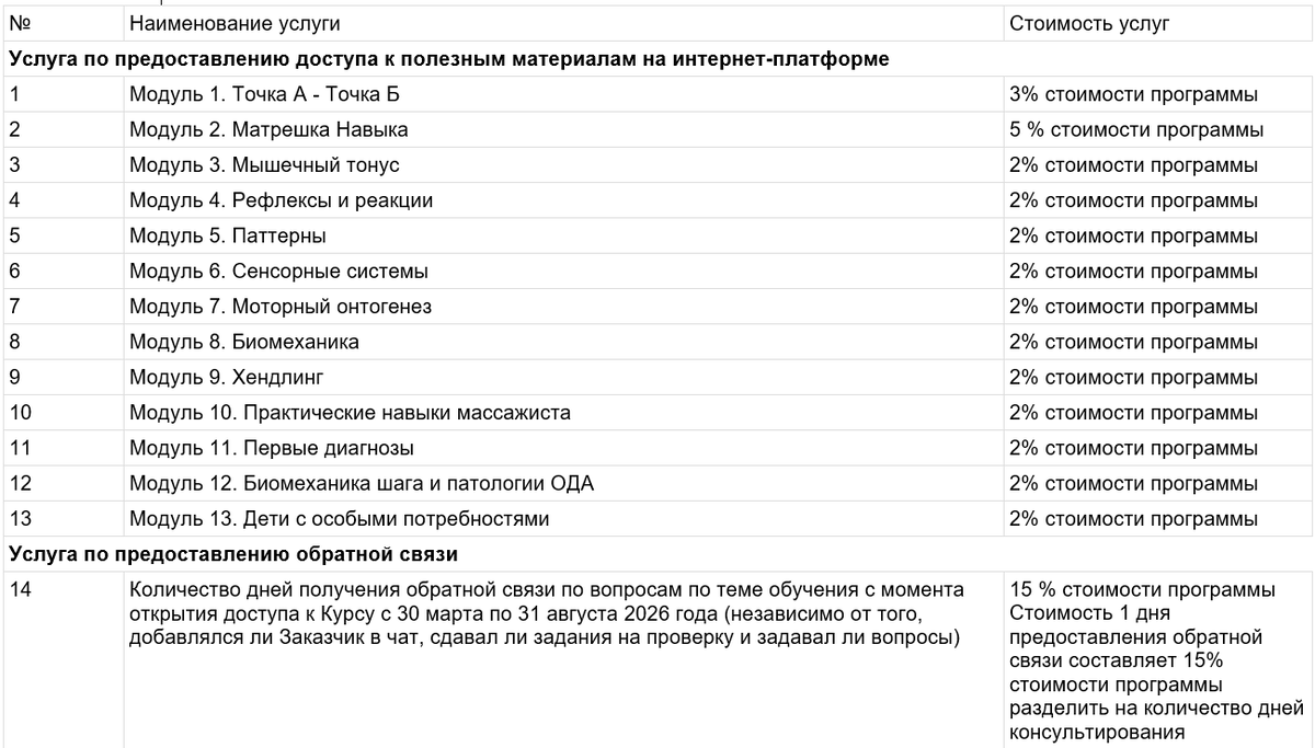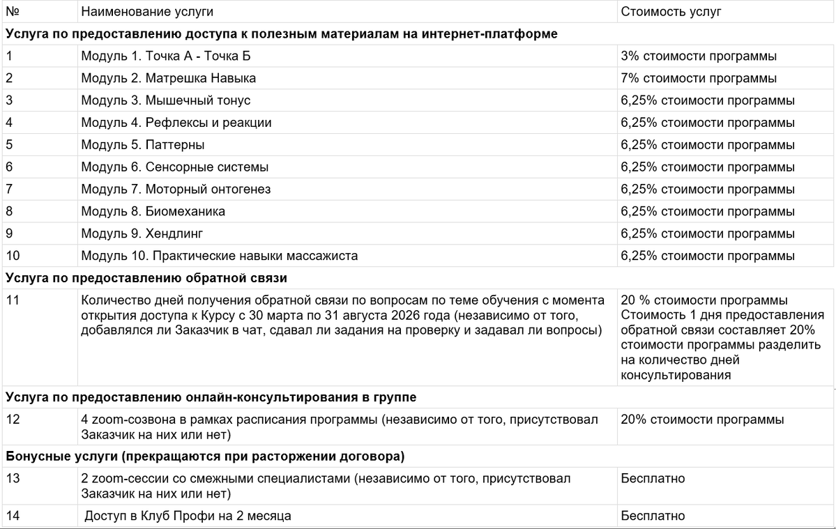 Стоимость указана на сайте Исполнителя https://massagnaya-mama.ru/DM_12p и зависит от действия акций. Акцепт оферты подтверждает факт ознакомления и согласия с ценой и объемом услуг. Оплата производится за весь срок оказания услуг на условиях оферты. Доступ к материалам на интернет-платформе прекращается с даты окончания срока доступа либо по причине досрочного расторжения Договора.