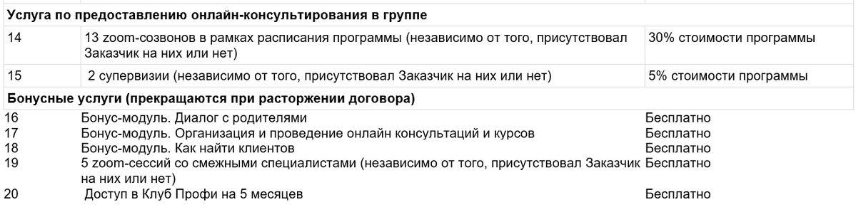 Г - сумма стоимости всех проведенных онлайн-консультаций с даты начала оказания услуг до даты получения заявления о расторжении договора Д - сумма комиссий банка и/или финансовых партнеров за предоставление рассрочки/кредита, а также иных расходов по выполнению обязательств по договору.
