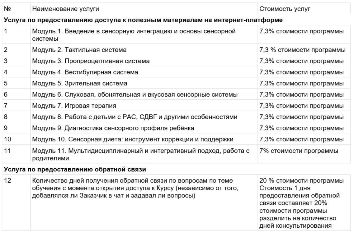 Стоимость указана на сайте Исполнителя https://massagnaya-mama.ru/sensor_integration_2p и зависит от действия акций. Акцепт оферты подтверждает факт ознакомления и согласия с ценой и объемом услуг. Оплата производится за весь срок оказания услуг на условиях оферты. Доступ к материалам на интернет-платформе прекращается с даты окончания срока обучения либо по причине досрочного расторжения Договора.