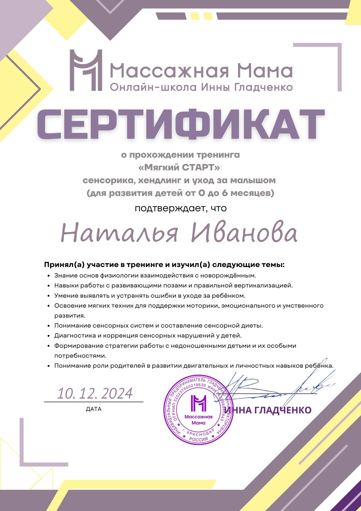 - сертифицированный специалист метода First step (Израиль) Фельденкрайз концепция по диагностике и развитию детей 0-12 мес.