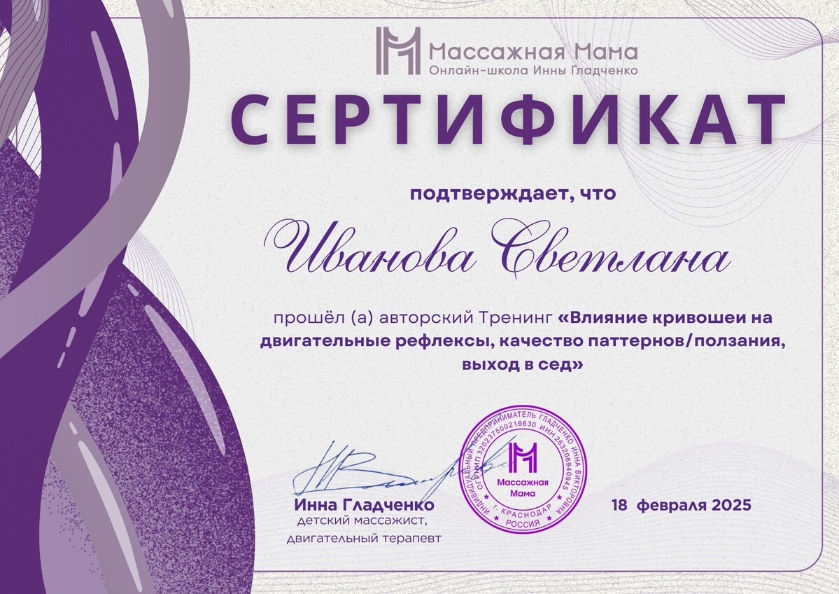 - детский массажист и двигательный терапевт с опытом работы 20 лет